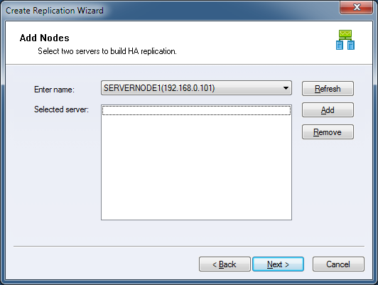 High-availability replication is the main function of HAReplicator which allows user to create Microsoft Windows Cluster Server (MSCS) without iSCSI SAN, instead of using SAN for shared volume, HAReplicator can create replication between local storages in two or more servers. Since there is no SAN node, user can create active-active high availability server by using only two server. Before you create replication, you need connect to at least two servers, if