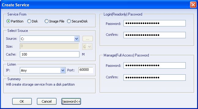 Source: Select the source which is going to be shared after selecting ' Form Partition' or 'From Disk' , and click the view button to select the image file if you select the 'From file' in Service Form .