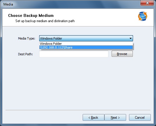 Select "\\192.168.0.112\Share" the Media Type list. Then press Next to continue.