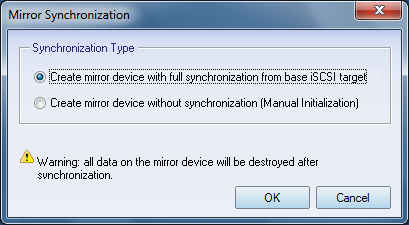 Now, the mirror target should be synchronized to the base target, if the two targets are both the new one and do not be initialized, we can choose Create mirror device without synchronization (Manual Initialization), otherwise, we must choose Create mirror device with full synchronization from base iSCSI target. Note: All data on the mirror device will be destroyed after synchronization. Step 4. Complete Application Creation