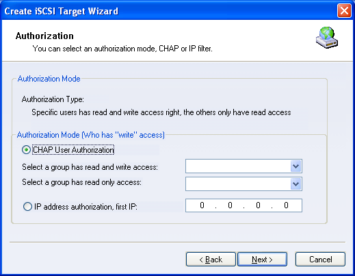 There are two levels of accessing permission: read and write permission and read-only permission. CHAP User Authorization : For read and write permission, select one user group who can be granted full read/write access to the iSCSI device. For read only permission, select another user group. Specific IP address authorization : User can also choose another authentication type, 'specify IP address' has write access. In this case, the user from specified IP can write the iSCSI device. All other users can only get read-only permission. To create a new group , See add a group description Press the Next button to continue. Step 4. Type the Target Name.