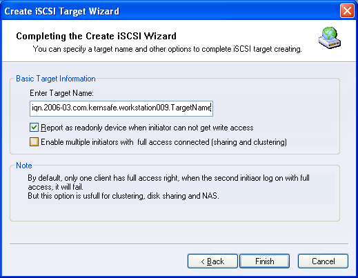 Press the Finish button to completing the iSCSI device creation. |