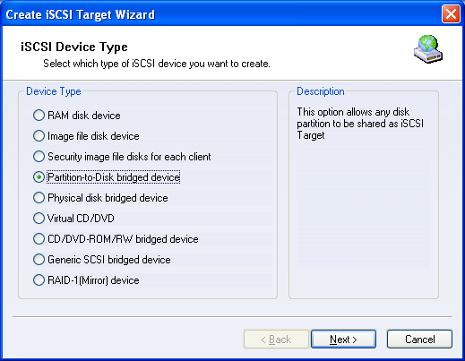 Choose 'Partition-to-Disk bridged device' on the Select