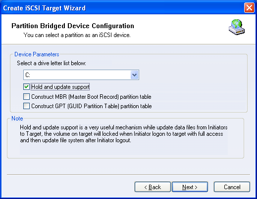 Partition-to-disk bridged disk device map an entire partition to an iSCSI disk device. iStorage server will apply system’s default file system to iSCSI device. For example, the partition is using FAT32 file system, the according partition-to-disk bridged disk will also use FAT32 file system. User cannot change the file system other than partition’s original file system. Creating A Disk Partition Device Follow the steps below to create a new image file: Step 1. Select Service-> Create Target from the Service pop-up menu On the main interface of iStorage Server .